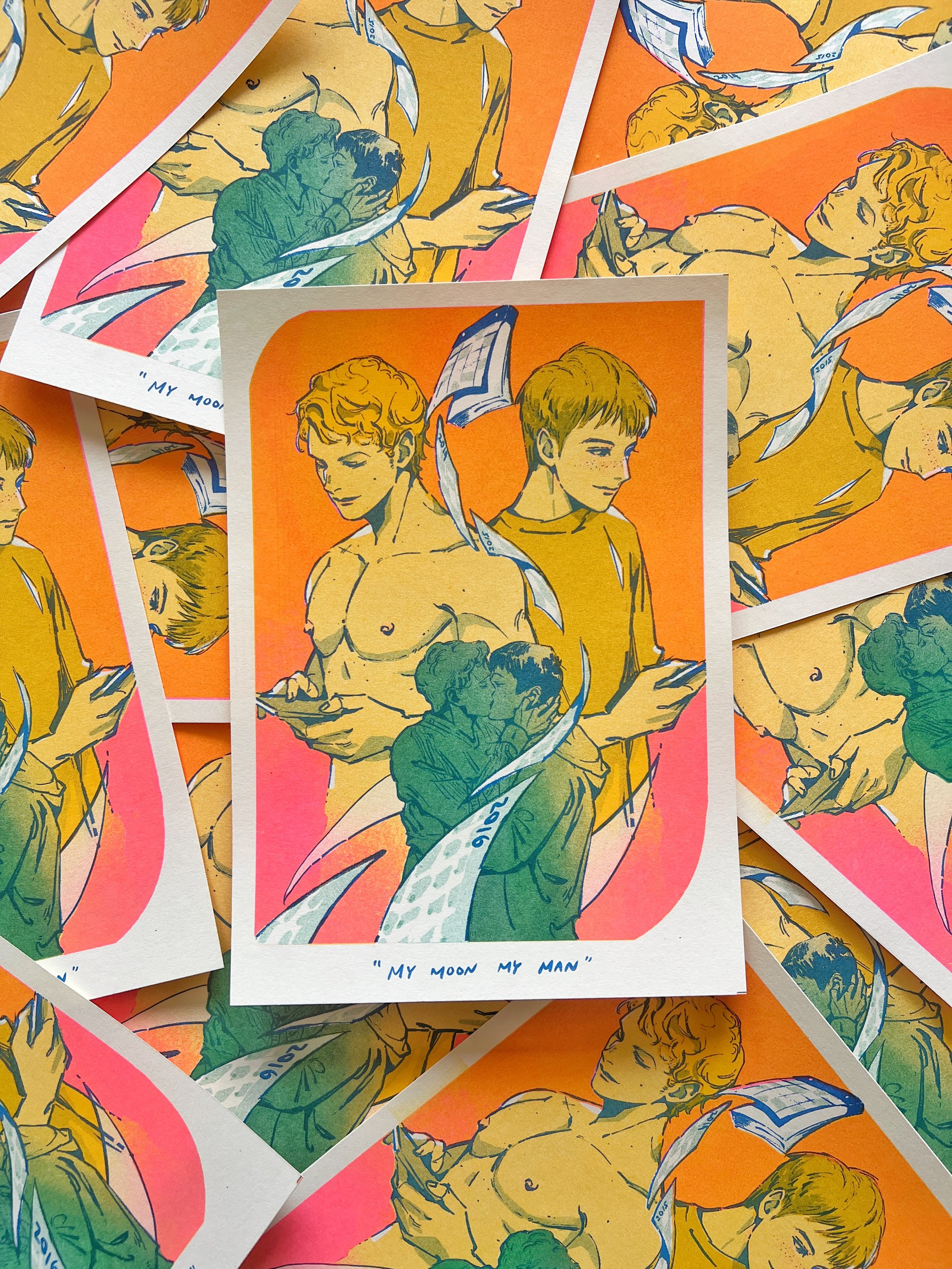 Risograph is a stencil-based printing technique that uses vibrant soy-based inks to produce uniquely textured, layered prints. Due to the nature of Riso, each print is one of a kind and might show slight variations or misalignments, which are part of its charm. Please handle Riso prints gently, as the ink can still smudge.